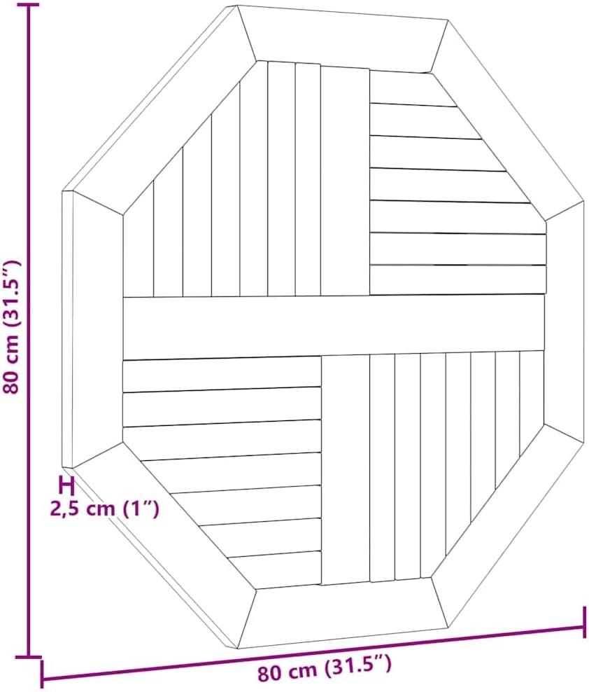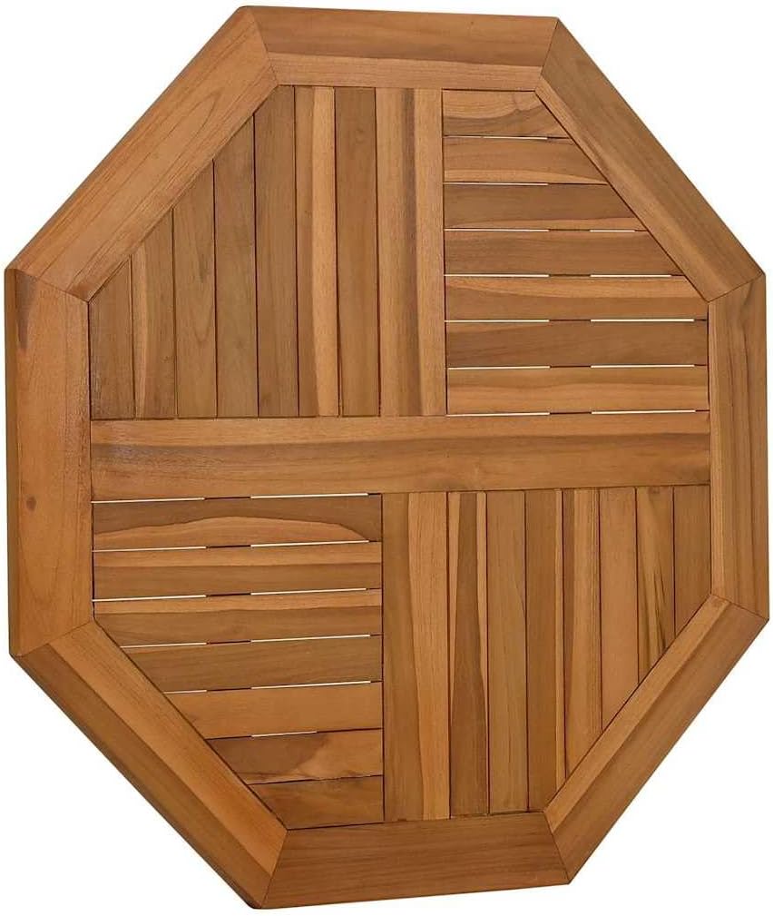 Give a new life to your garden table with this wooden table top. It is an excellent solution for freshening up your table.Solid teak wood: Solid teak wood is a beautiful natural material. It has been seasoned, kiln dried and then fine sanded to give a very smooth appearance. Teak wood is known for its exceptional strength and weather resistance.Versatile applications: The replacement table top can be combined with different bases according to your needs.Parasol hole: There is a parasol hole in the table top so you can easily attach a parasol to create a shady spot.Rustic design: With a simple and clean look, the wooden furniture top will add a rustic charm to your dining areas.Easy-to-clean surface: The smooth tabletop is easy to clean with a damp cloth.Good to know:Each item is unique with variations in colors and grains. The delivery is random, ensuring the exclusivity and individuality of your product.Material: Solid teak wood with waterbase finishDimensions: 31.5" x 31.5" x 1" (L x W x T)Shape: OctagonalDelivery only contains the table top