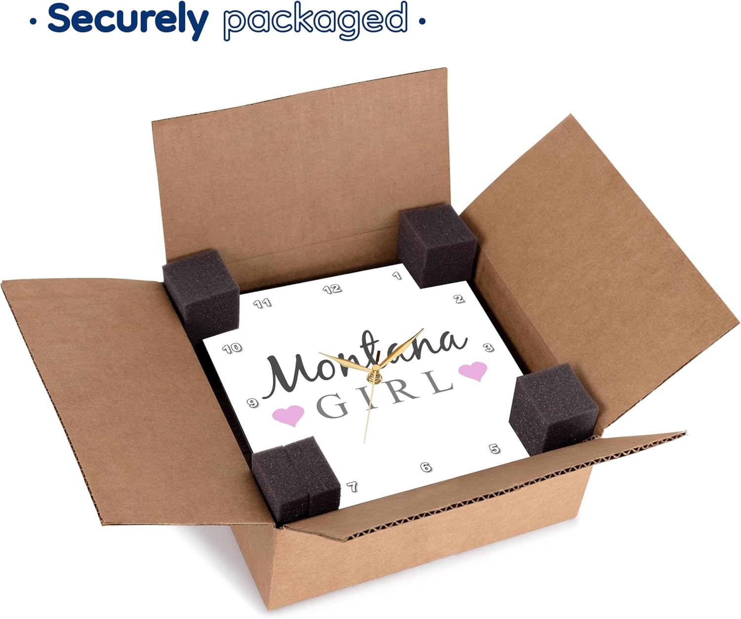 Montana girl - home state pride - USA - United States of America - text and cute girly pink hearts wall clock is a wonderful complement to any room in your home or office. Made of durable high grade aluminum. This frameless clock has a high gloss mirror like, UV coated, scratch resistant finish and is suitable for a moist environment. Sizes available range from 10" x 10" to 15" x 15". requires one AA battery; not included. Battery box is not covered.