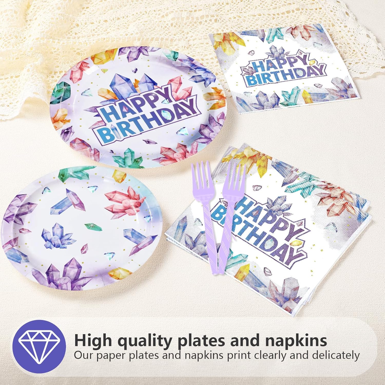 【Crystal Birthday Theme Design】Perfect for a birthday party with a glamorous crystal vibe, this party set showcases lively designs filled with crystal, gem stone and diamond elements. Each plate and napkin is decorated with colorful crystals, purple gem stones, diamonds, and “Happy Birthday” motifs. The crystal party tableware brings a shiny and festive atmosphere to your celebration.