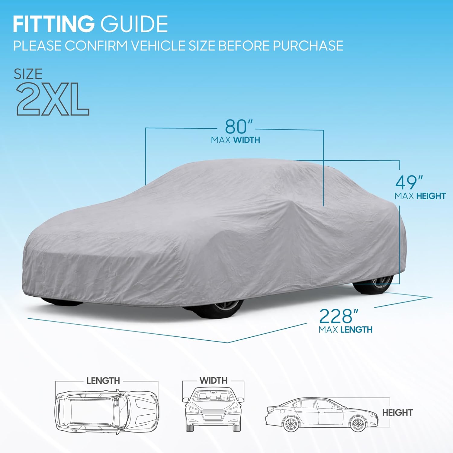 Shield your vehicle from the elements with a Universal Fit Car Cover, designed for reliable indoor and outdoor protection. Engineered to guard against UV rays, rain, snow, dust, pollen, tree sap, and debris, this all-weather cover helps preserve your car’s exterior and interior from damage caused by daily exposure.Crafted from water-resistant, breathable materials, this cover prevents moisture buildup while ensuring your vehicle stays dry and well-ventilated. The UV-resistant fabric protects against sun fading and heat damage, making it ideal for year-round use in various climates.Featuring an elastic hem and adjustable straps, this cover delivers a secure, snug fit that stays in place even in windy conditions. Its lightweight yet durable construction allows for quick installation and hassle-free removal, making it a convenient choice for both daily and long-term vehicle storage.Whether you're parking your sedan or SUV outdoors, in a garage, or under a carport, the Universal Fit Car Cover offers dependable protection and peace of mind. Designed for durability and ease of use, it’s the perfect solution to keep your vehicle clean, covered, and protected in any environment.PROLONGED USE ADVISORY: Car covers are intended for temporary protection and should not be left on a vehicle for extended periods. Prolonged use beyond a few weeks without removal may lead to trapped moisture, condensation buildup, and potential damage to the paint or clear coat. It is recommended to periodically remove the cover, allow the vehicle to air out, and inspect for any signs of moisture accumulation or wear.