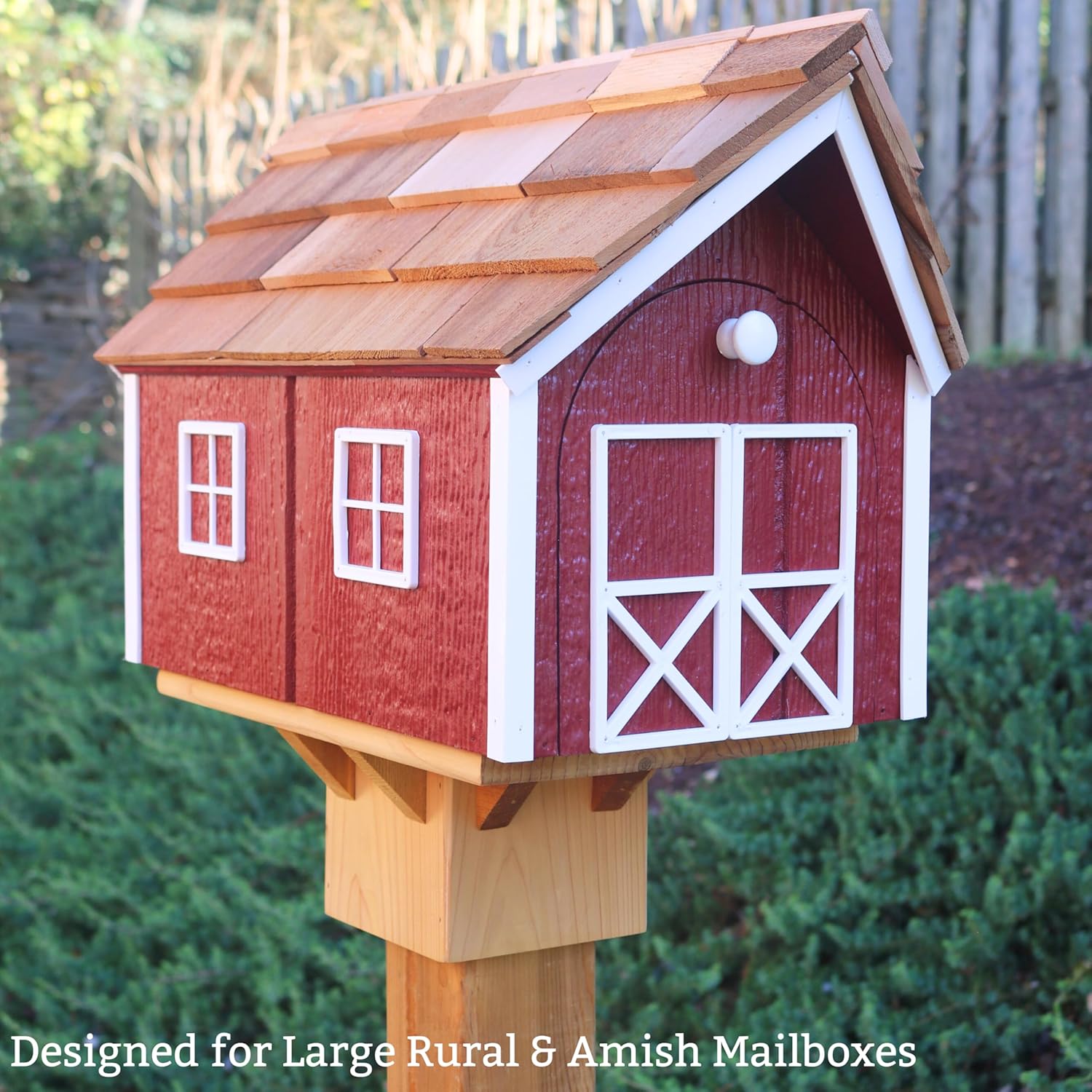 This Cedar Mailbox Mount is made in Maryland, USA by a small business and provides a sturdy mounting surface for Amish House-style mailboxes, large rural mailboxes, and large bird feeders. Built from natural cedar for outdoor durability and coated with a penetrating waterproofer with dual-action UV protection. The mailbox mount secures directly to a 4x4 wooden post (not included) and arrives sanded, sealed, and ready for installation. Designed to complement the traditional look of Amish-style house mailboxes, this cedar mount provides a more natural appearance than a standard mailbox mount.