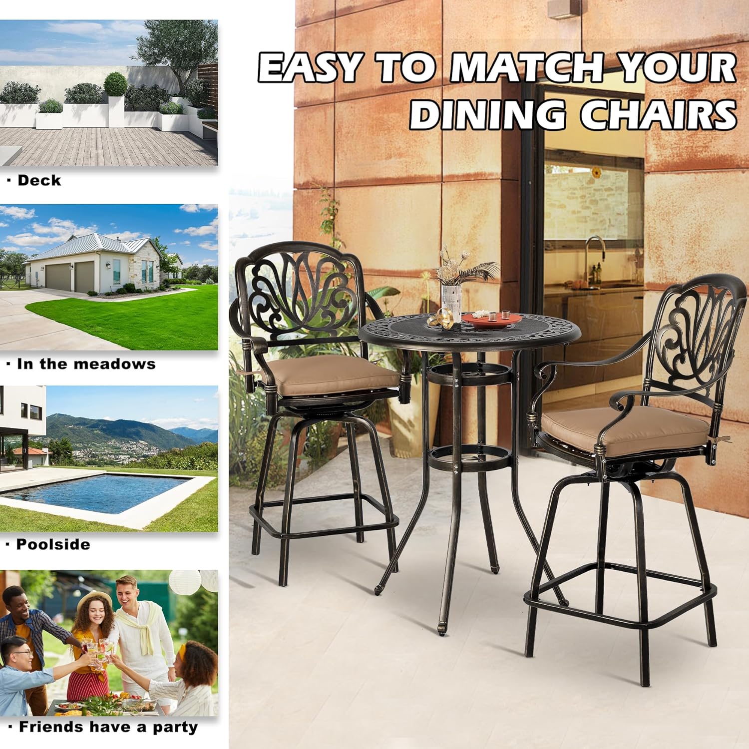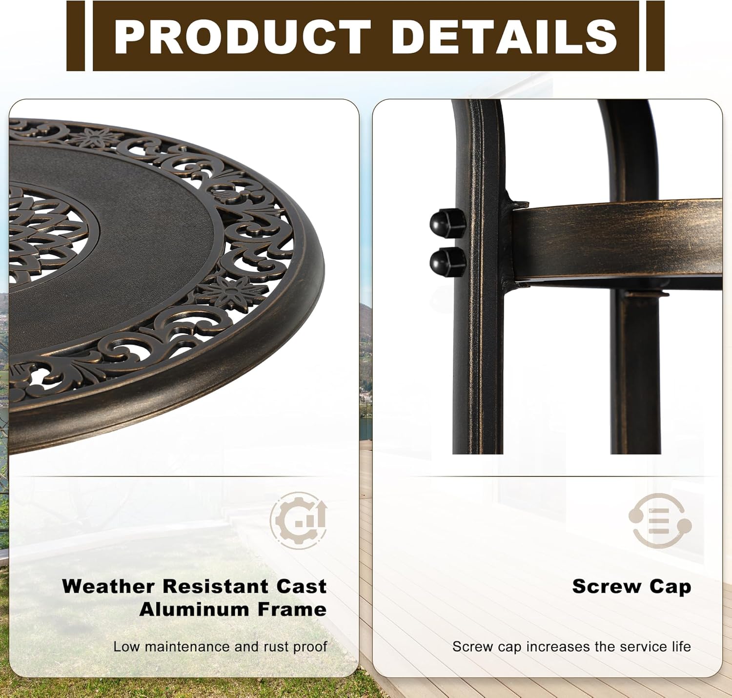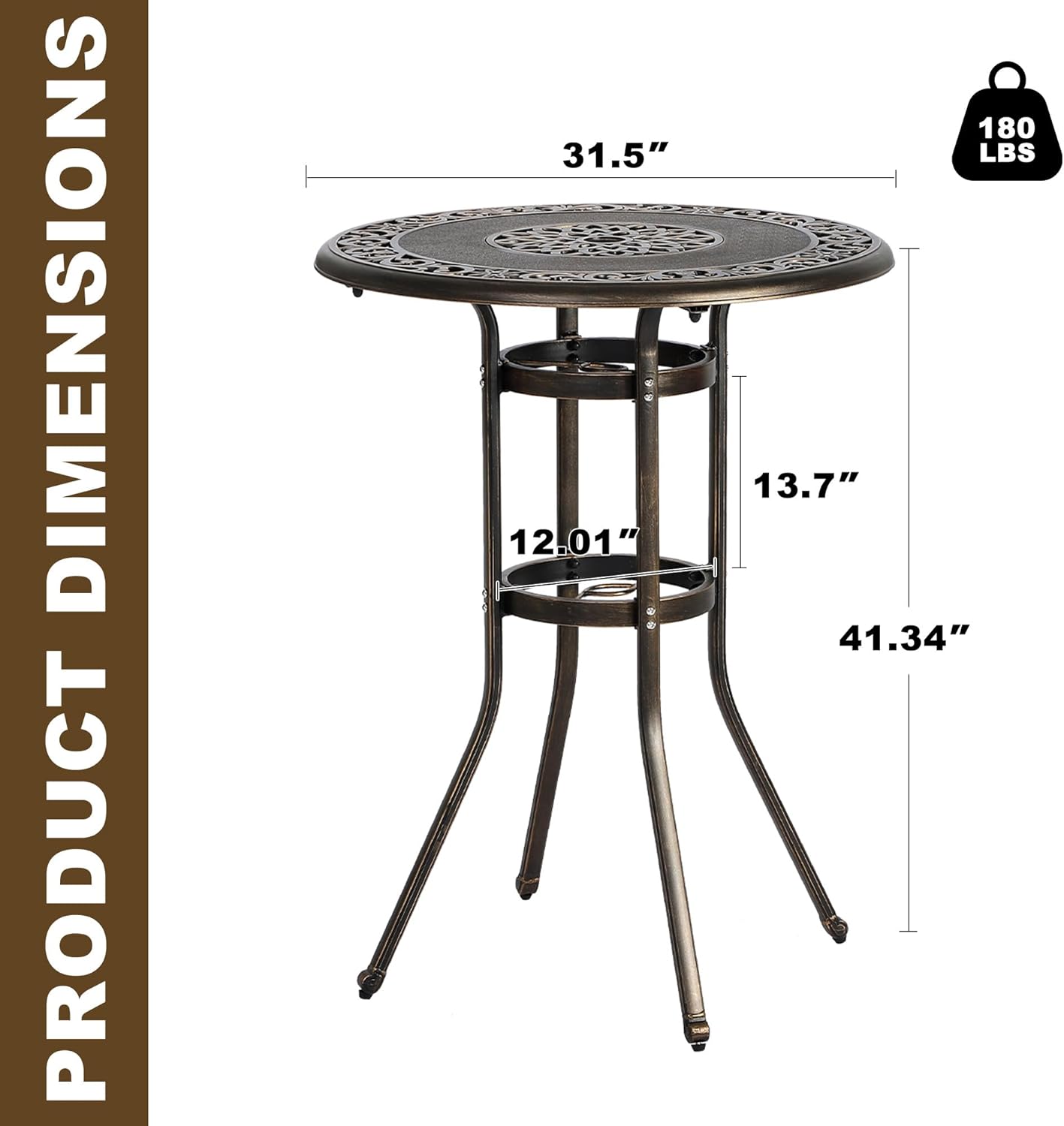 Description:Grepatio outdoor bar table is the perfect addition to any space outside, like a backyard patio, outdoor deck, in a sunroom or garden, or near a pool, outdoor bar, grill, or BBQ party.Features:1. Greaptio outdoor height bar table is constructed with UV-resistant and RUST-resistant cast aluminum frame.2. Ergonomically designed for comfort and durability, brings you years of enjoyment.3. An additional dia 2" hole in center of bar table to add an umbrella providing a cool shade experience.4. The bottom of our high bar table is a layer of storage design.5. This outdoor high bar table suitable for pool, beach, bacalony, backyards, patios, lawn, gardens and more.Specifications:- Product Size: 31.5"W x 31.5"D x 41.4"H inch- Material: High Quality Density board and Metal- Weighs: 22 Lbs- Weight Capacity: 180 pounds- Assembly Required: Yes- Color: BronzePackage Include:- 1 x Outdoor Bar Table- 1 x Manual