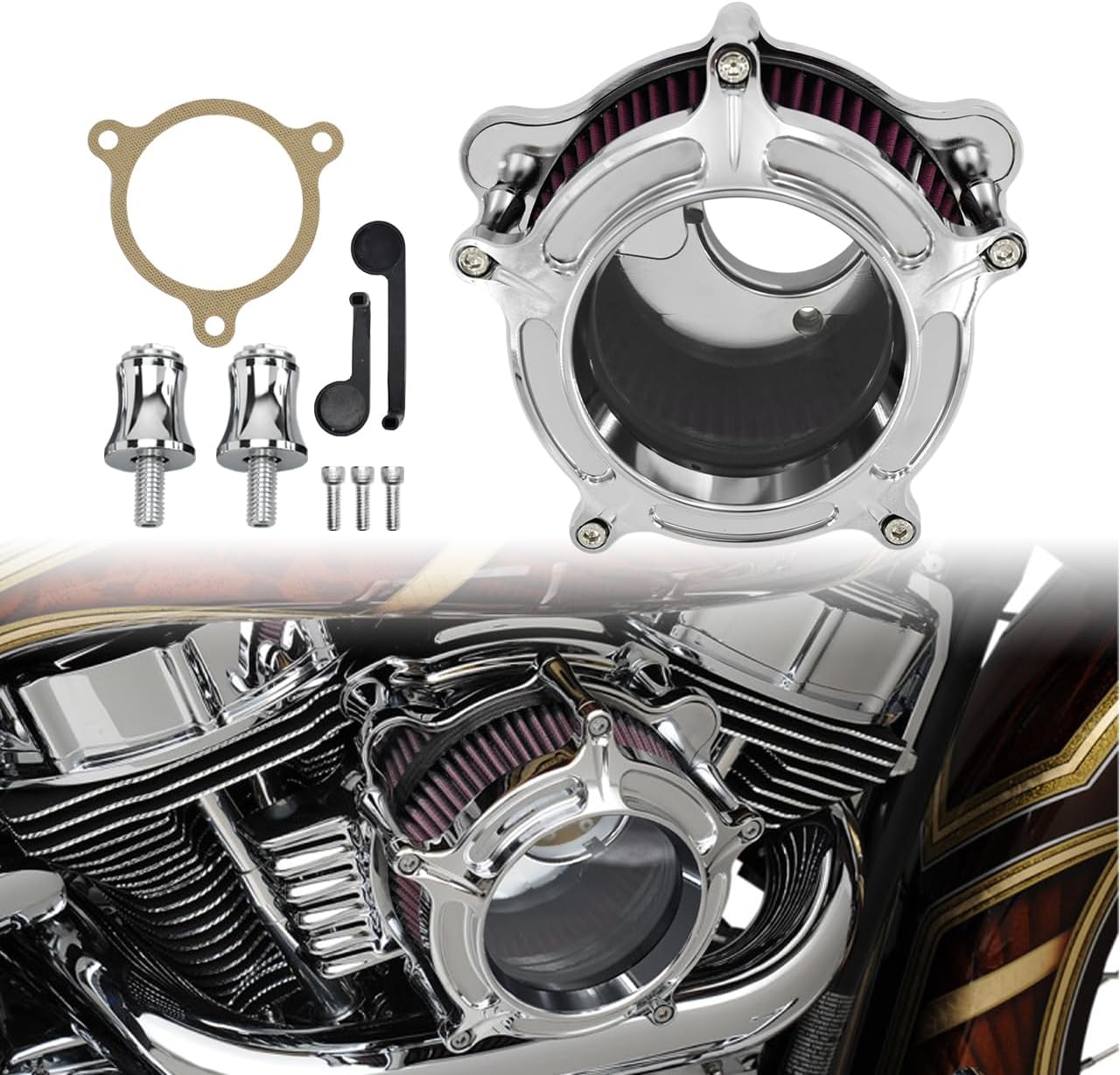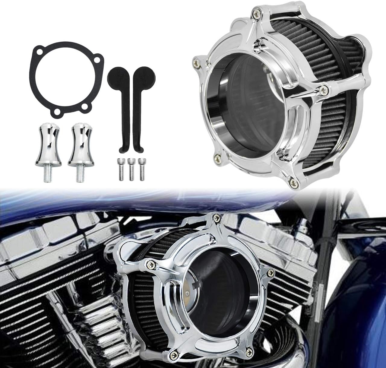 Features:Premium Quality Aluminum Motorcycle Air Cleaner Intake Filter that reusable, simple wash, dry and re-oilBillet Aluminum backing plate with internal breathing passages for super clean installationSpecifications:Housing Color: Chrome(as the picture shows)Material: CNC Billet AluminumApplication: Air Cleaner Intake Filter System KitFitment:Type A Fitment: Fit For Sportster XL 2004-2022Type B Fitment: Fit For Dyna/FXR 2000-17,Fit For Softail 2000-2015,Fit For Touring 2000-2007. Excludes: 2017 Low Rider S FXDLS, 2014-2015 CVO Softail Deluxe FLSTNSE, 2011-2012 Softail CVO Convertible FLSTSE, 2013-2014 Breakout CVO Custom FXSBSE. Fits cable throttle with Delphi Fuel Injection or CV Carburettor equipped models only! Does not fit Magneti-Marelli fuel injection equipped modelsType C Fitment: Fit For Dyna FXDLS (2017), Fit For Softail (2016-2017),Fit For Touring (2008-2016),Fit For Trike (2008-2016),Fit For 2017 Low Rider S FXDLS, 2014-2015 CVO Softail Deluxe FLSTNSE, 2011-2012 Softail CVO Convertible FLSTSE, 2013-2014 Breakout CVO Custom FXSBSE. Fits Throttle By Wire Models Only!Type D Fitment: Fit For M8 Softail 2018-2024; Fit For M8 Touring 2017-2023; Fit For M8 Trike 2017-2025; Fit For Road King Special 2024; Fit For Road Glide Limited 2024; Fit For Ultra Limited 2024; Fit For Road King Special 2025