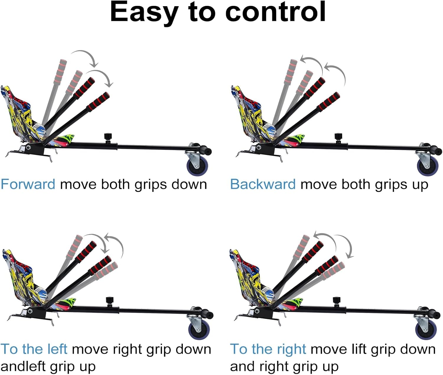 Turn your ordinary hoverboard into an exhilarating go kart with the ilKqeppe Hoverboard Attachment – the ultimate hoverboard who crave adventure! Engineered for safety and fun, this hoverboard seat attachment converts your hoverboard into a stable, seated crazy cart, eliminating balance strain and fall risks. Whether you're cruising the neighborhood or racing on the lawn, our go karts for adults design delivers unmatched control and comfort.The durable alloy frame features tool-free adjustment, letting you customize the length between 77 cm and 88 cm (30.31"–34.65") for a fit. Dual foam grips and a 360-degree front caster wheel ensure responsive handling, while the rear-wheel drive system enables agile turning and smooth braking. With non-slip footpads, secure straps, and an ergonomically designed seat, every ride is stable, safe, and stylish.Perfect as a hoverboard attachment for family fun, gifts, or outdoor recreation, this hoverboard go kart kit opens up new ways to enjoy your existing hoverboard. Note: hoverboard not included. Colors may vary slightly due to lighting and screen settings. Manual measurements allow for minor deviations.Item Name: Hoverboards Stand Material: AlloyCompatible: for 6.5", 8", 10" HoverboardsFeatures: Adjustable Joystick, Anti-slip Pedal, Ergonomic HandleSize Details:Adjustable Length: 77cm - 88cm/30.31" - 34.65" (Approx.)Width: 38cm/14.96" (Approx.)Notes:Due to the light and screen setting difference, the item's color may be slightly different from the pictures.Please allow slight dimension difference due to different manual measurement.Package Includes:1 x Hoverboards Stand (Not Included Hoverboards)1 x User Manual