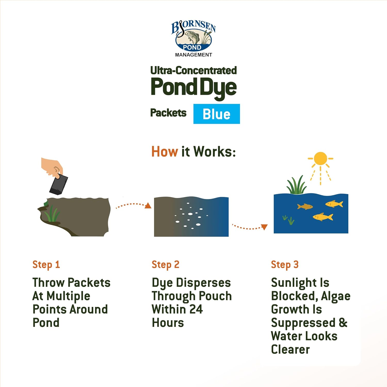 Ultra-Concentrated Pond Dye Packets decrease sunlight penetration into the depths of your pond. Also improves the aesthetic of your pond by coloring brown water a more pleasing color. Three water soluble Ultra-Concentrated Pond Dye Packets treat a one acre body of water 6-ft deep. Pond Dyes limit sunlight penetration to the bottom of the pond. By using Bjornsen Pond Management Ultra-Concentrated Pond Dye Packets along with MuckEater Pelleted Pond Bacteria, PondFit Beneficial Pond Bacteria, and Phosphate Binder you will create a natural and proactive approach to pond management. Our specially formulated colors (Blue, Midnight Blue, and Black) are very deep and rich.