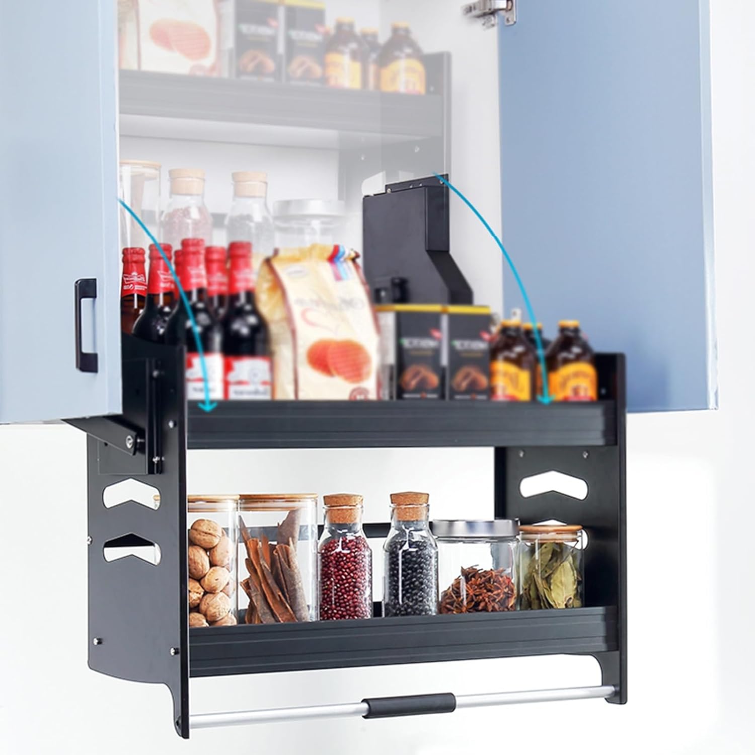 This Pull Down Basket is made of Aluminum alloy, easy to clean.Thickened side panel combination of strong double support arms, Drop Down Basket Storage use more stable, comfortable handle does not hurt the hand,the use of hydraulic damping booster design, also be easily pushed and pulled, prevents sudden lowering and homing, ensuring stable, smooth, quiet, and easy pull-down and return, pick and place no trouble,height does not limit the space,Drop down Basket can be used in the kitchen bar cafe cabinets,Pantry,Closet, up-and-over doors and double door style can be used, Make full use of the unreachable space above the cabinet, Pull down shelving cabinets can provide more storage space Specification: Product Name:Cabinet Pull Down Shelving,Heavy-Duty 2-Tier Wall Pull Down Shelf,Convenient Cabinet Pull Down Shelving,Spice rack,Kitchen Wall Cabinet Storage,Pull-Out Cabinet Organizer Pull-Down Shelves Material:Aluminum alloy Product Size:364/464/564/614/664/714/764/814/864x280x540mm Applicable internal height:>600mm Applicable internal depth:>310mm Package Includes: Cabinet pull-down shelf x 1,Accessories x1 Warm tips: 1. please be sure to punch the installation, screws need to be screwed to the countersunk head 2. screw the bottom of the product as much as possible, completely and then pull down, more smooth fit Note: 1. Due to computer resolution, there may be errors in product color, please refer to the actual product 2. Due to manual measurement, there may be an error of 1-2cm, please refer to the actual product