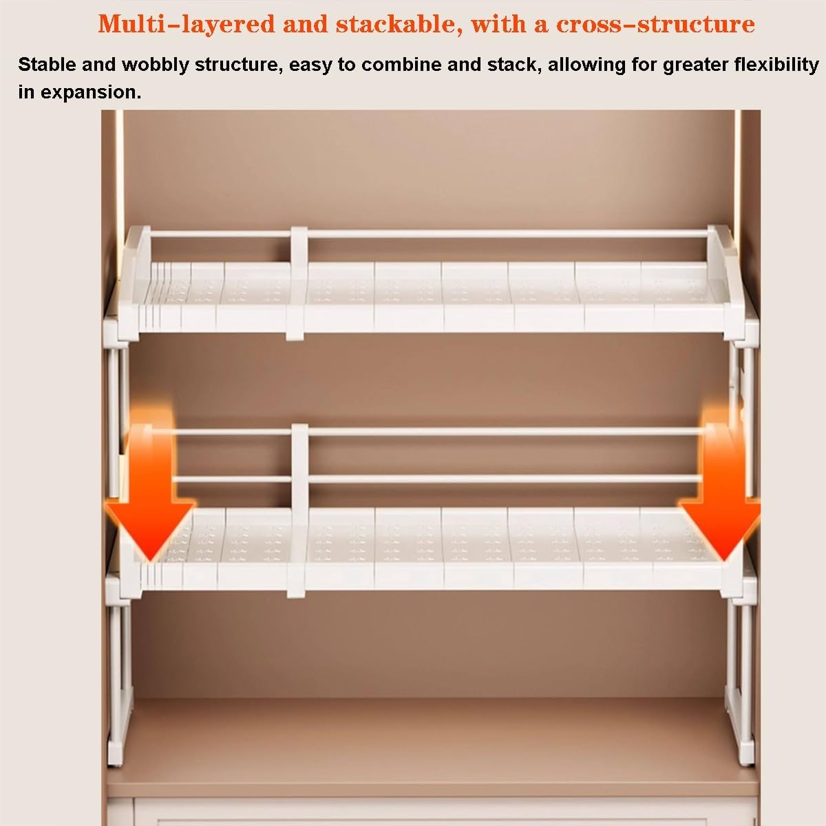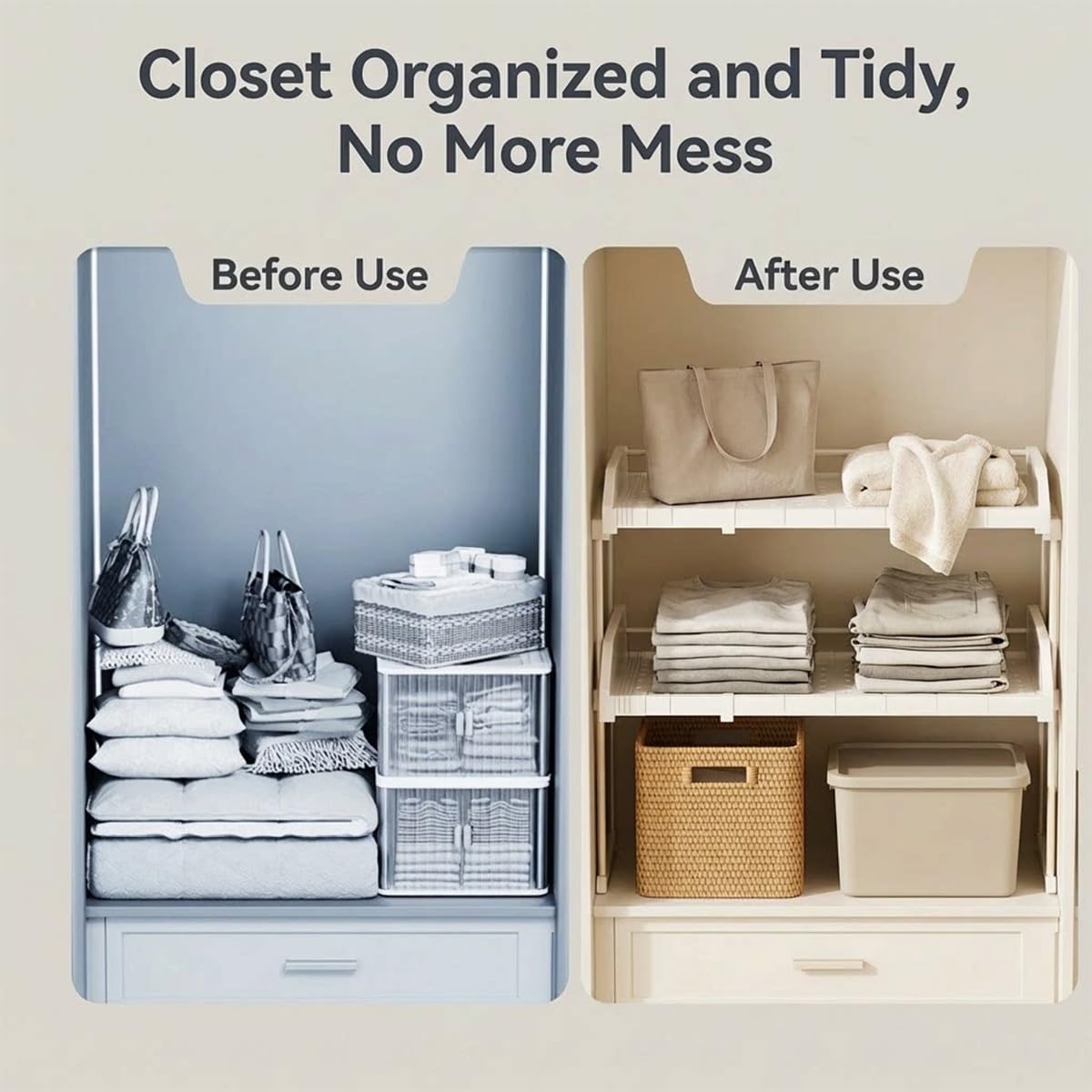 This wardrobe shelf is made of metal and can be used independently or stacked for easy access, keeping your countertop tidy and organized.Name: Expandable Shelf for CabinetMaterial: Metal+PPColor:whiteApplications: Storage cabinets, wardrobes, shoe cabinets, bookshelves, bathrooms, kitchensInstallation Instructions Package: 1 x Expandable closet shelfNote: Please measure the dimensions of your closet before purchasing to choose a suitable shelf. The depth of the shelf should be slightly less than the depth of the closet to avoid obstructing the closing of the doors.