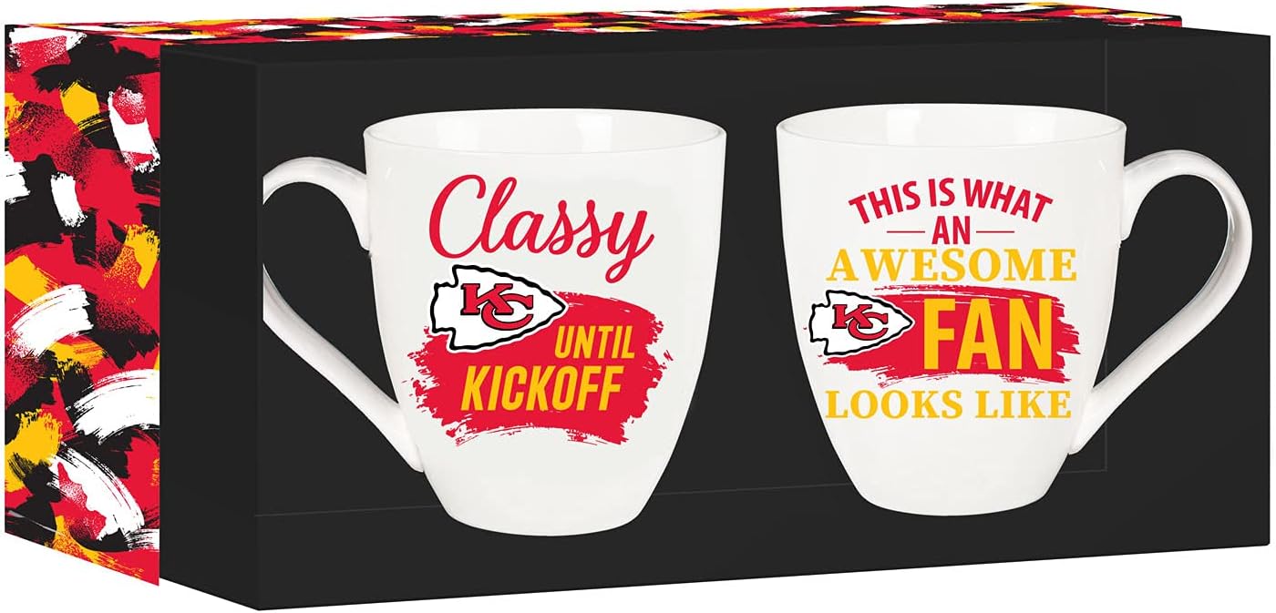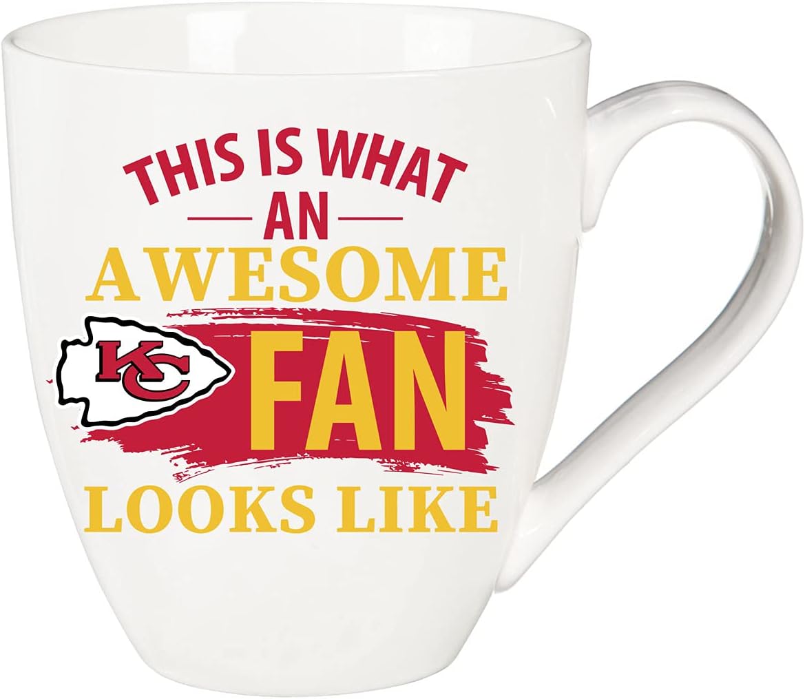 Measures approximately 5.87 x 4.75 inches. This Ceramic Cup O'Java is microwave and top rack dishwasher safe. Comes with a matching gift box. Enjoy a hot coffee or refreshing beverage with these mugs that holds up to 17 oz. Its circular-shaped handle helps you enjoy your morning coffee or hot tea comfortably while supporting your favorite NFL team. Features the official Kansas City Chiefs logo and colors. These mugs have a sleek design and also include playful text to get you ready for gameday. Reads: "This is what an Awesome Fan Looks Like" and "Classy until Kickoff." Perfect gift for a friend or family member who is a fan of the Kansas City Chiefs. Evergreen Sports offers nothing but officially licensed college and professional sports league products. We pride ourselves on unique and eye catching designs for every item. Our products make the perfect gift for any occasion for family and friends or yourself! Evergreen Sports features NFL, NHL, MLB & NCAA licensed products. We carry items for every fan shop with tons of high-quality sports merchandise for NFL, NHL, MLB and NCAA teams. We are proud to bring tailgating and gift-giving items any fan could appreciate. Click on the Evergreen Sports Link under product name to shop our full catalog.