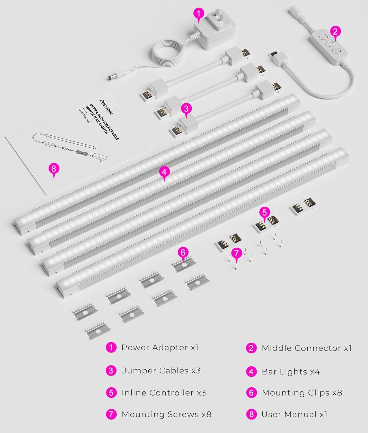 | Included Components | 8*Mounting Screws 8*Mounting Clips 3*Middle Connector 1*Inline Controller 1*Power Adapter 3*Jumper Cables 4*Bar Lights |