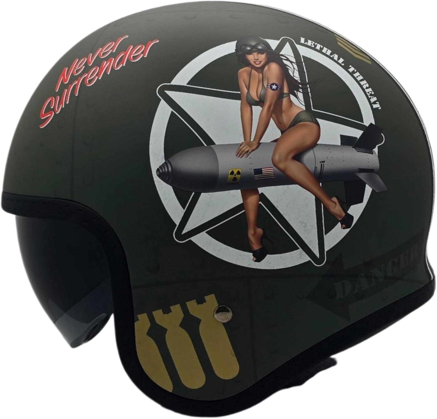 Vega V8 RETRO STYLE OPEN FACE HELMET -Classic retro style with modern day features. -Lightweight polycarbonate shell weights only 2.5 lbs. -Vega Comfort Tech Soft comfortable wic dri suede liner. -Easy to operate Mirror Chrome drop-down sunshield included. -Easy to operate quick release buckle system. -5-year warranty -Meets or exceeds US DOT FMVSS No.218 & ECE R 22.05 Safety Standards